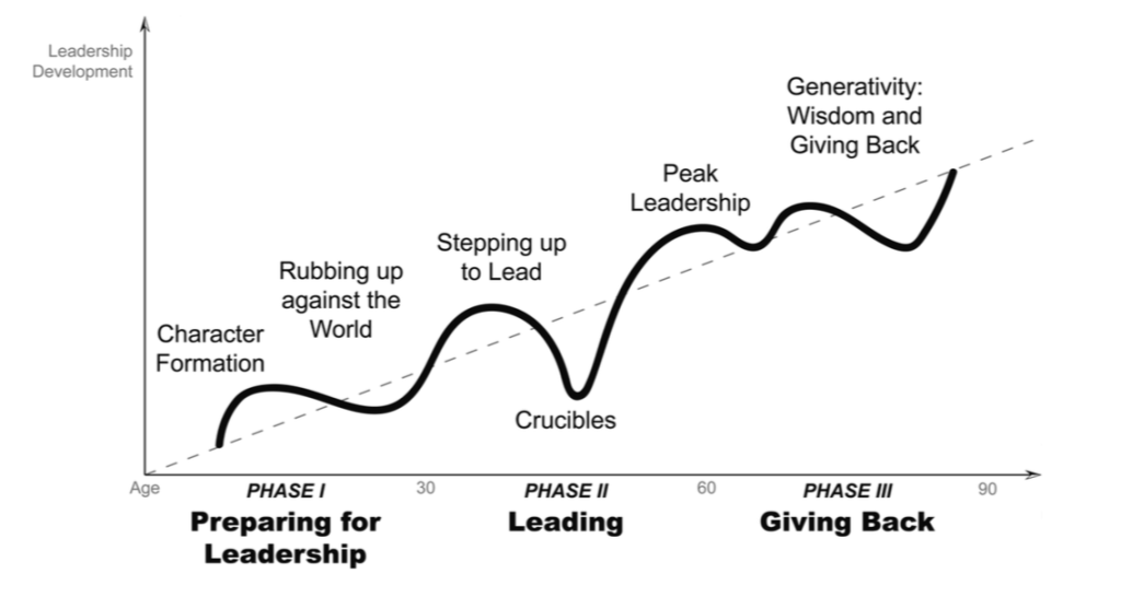 According to the work of professor, author, and leadership researcher, Bill George, leadership development can be categorized into three stages – Preparing for Leadership, Leading, and Giving Back.